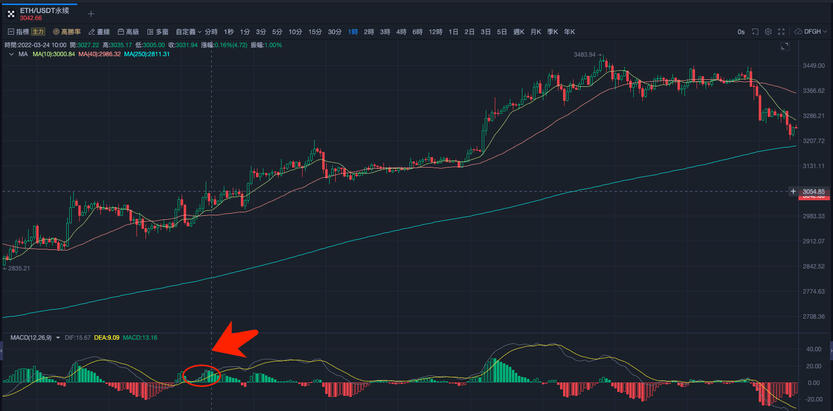 举例:1小时最新k线图,MACD的DIF和DEA收敛之后发散的过程中, 成交量是放大的,说明趋势还在延续,是一个好的中期卖出信号。