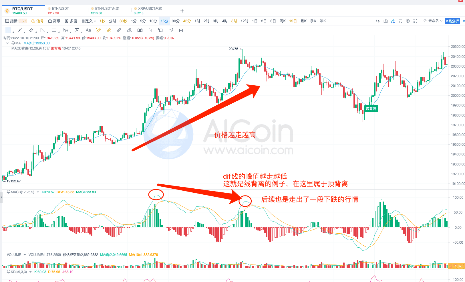 口诀: 当 K 线走势一峰比一峰高时,KDJ 值却越走越低,则为顶背离;当 K 线走势一峰比一峰低时,KDJ 值却越走越高,则为底背。
