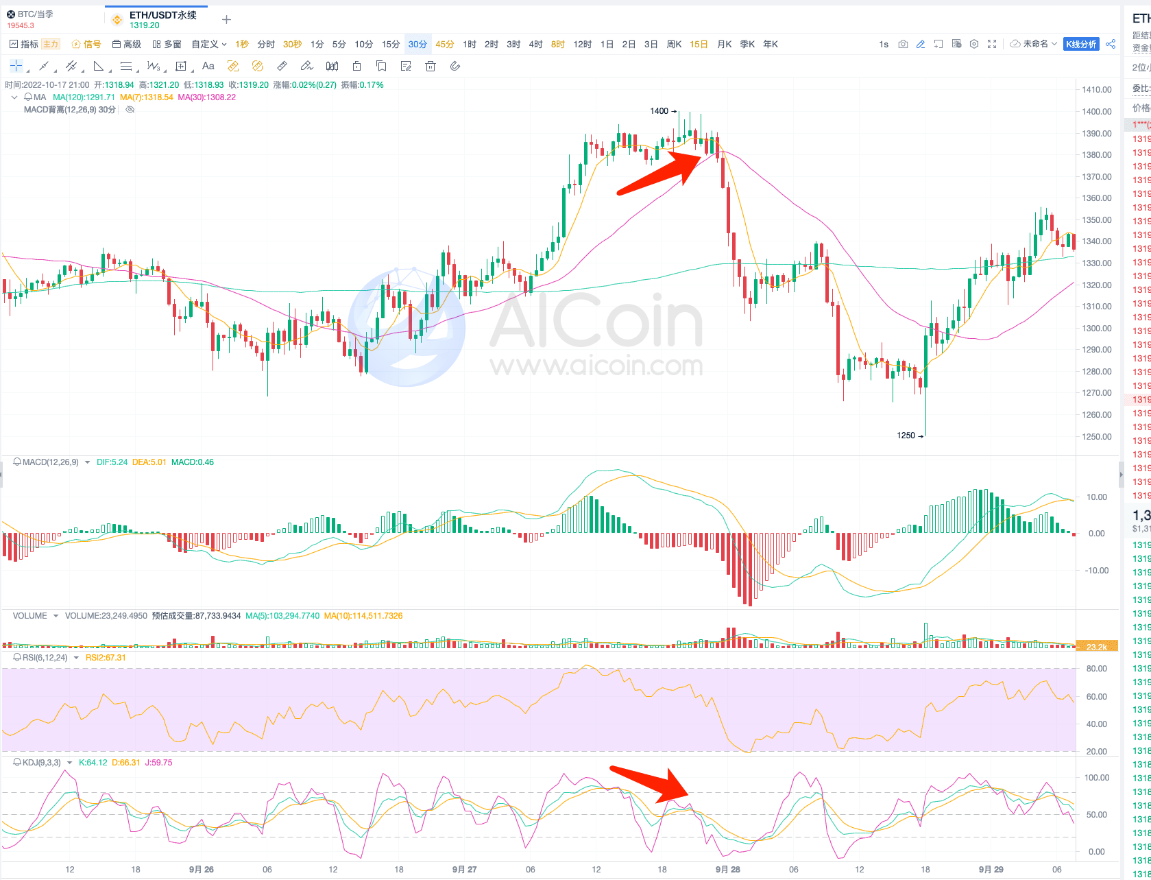 理解:顶背离是价格上升而 KDJ 指标拒绝上升,市场空头力量已开始展现;底背离是价格下跌而 KDJ 指标拒绝下跌,市场的多头力量已开始展现。